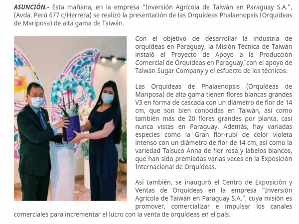 臺農投巴拉圭子公司的蝴蝶蘭展售中心於2021年4月14日正式開幕,以提供蝴蝶蘭銷售、栽培養護資訊與商業輔導為主。這是臺農投公司在巴拉圭所設立的第一座蝴蝶蘭展售中心。巴拉圭子公司總經理曾穀豐表示,展售中心的設立將為巴拉圭當地提供最新的蝴蝶蘭銷售訊息、蝴蝶蘭養護資訊與相關單位展售活動的接洽,也是臺灣在協助巴拉圭蘭花產業鏈建構重要的一步。